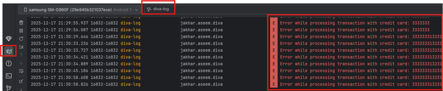안드로이드 스튜디오에 logcat 기능이 있다. 이는 해당 디바이스에서 생성되는 모든 로그를 수집할 수 있는 도구이다. (adb 툴에서 제공) 해당 툴 실행 후 diva-log 를 필터하니 에러가 발생한 크레딧 카드 넘버가 출력된다.