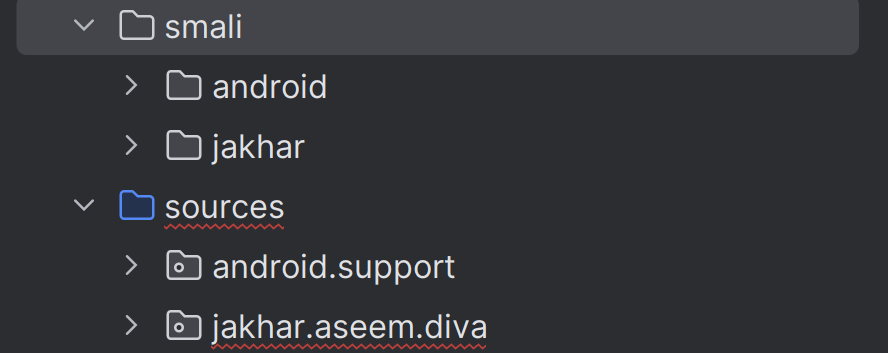 취약 모바일 앱 DIVA - 1 에서 정적 분석 준비를 끝냈다. 폴더를 열면 smali랑 sources가 있는데, sources가 smali 코드를 자바로 디컴파일(역변환)한 폴더이다. 가능하면 smali 코드는 안 볼 생각이다.. (내 뇌는 기계가 아니야...)