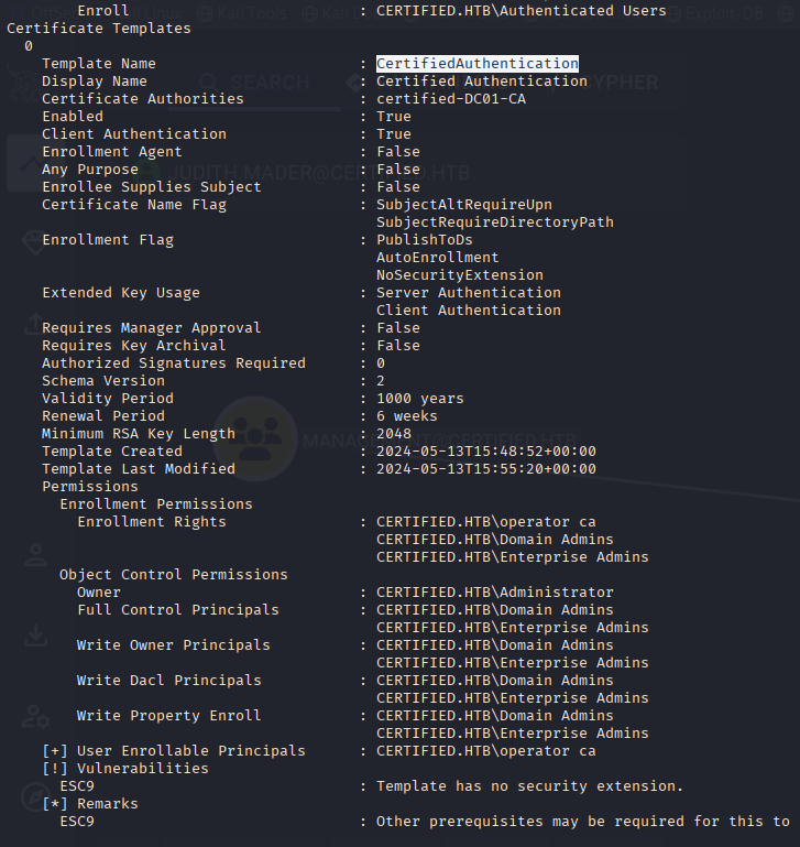 CertifiedAuthentication template has ESC9 vulnerability