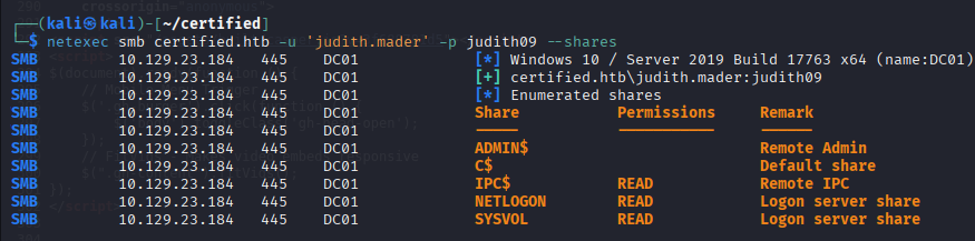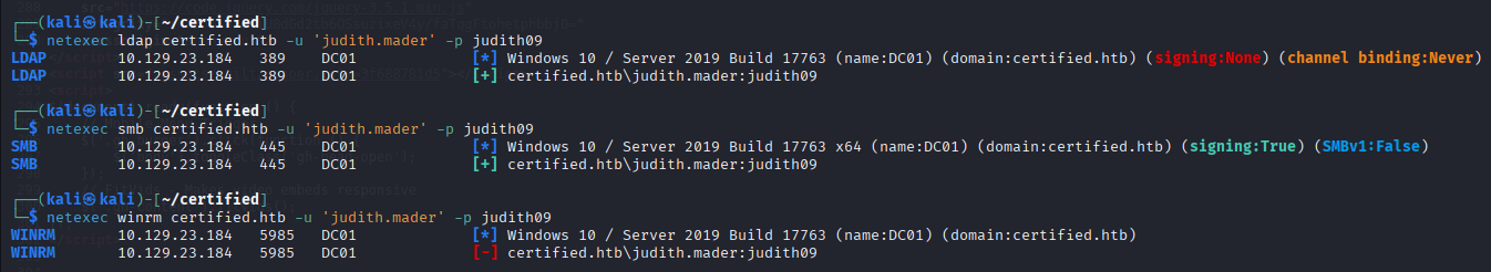 Command: netexec ldap certified.htb --dns-server 10.129.23.184 -u 'judith.mader' -p judith09 --bloodhound -c All
